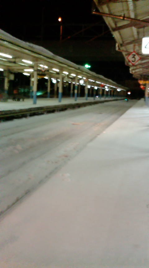 帰り。寝台列車なんだけど少しでも安く済ます為に自由席。長距離通勤している身になればたかだか4〜5時間程度なら全然平気。逆に満員電車の10分の方が耐えられない。1時間なら失神するレベルで無理。で、本当は電車がホームにゆっくりと入ってくる感傷的な構図を撮りたかったんだけどなんと…