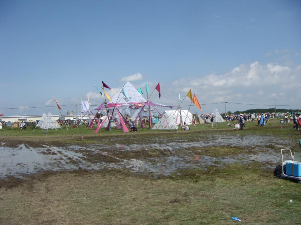 テント組みの設営がこの沼地のお陰で思いのほか手間取っているらしくサンステに向かう途中テントサイトの引き換え場所が長蛇の列。嫌な予感は的中。開始 20分前位に到着したんだけど、人が疎ら。この日トップバッターのdustboxと同じくEARTH TENTでやるチャットモンチー辺りとか観たくても観れない人結構居たんじゃないかなぁ。